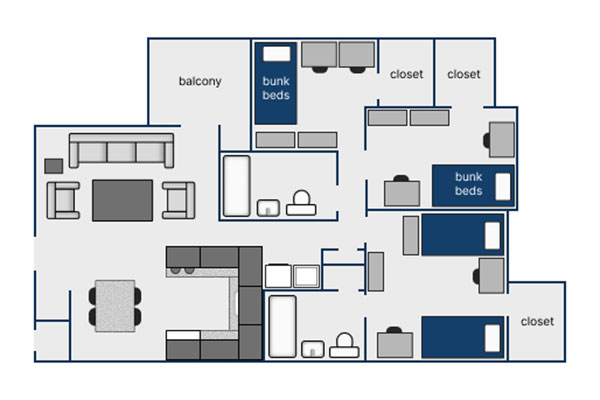 Depending on the number of incoming freshmen from year to year, CCU may add a third roommate to room A (the master bedroom). These students share the master bathroom and are easily accommodated in the room.